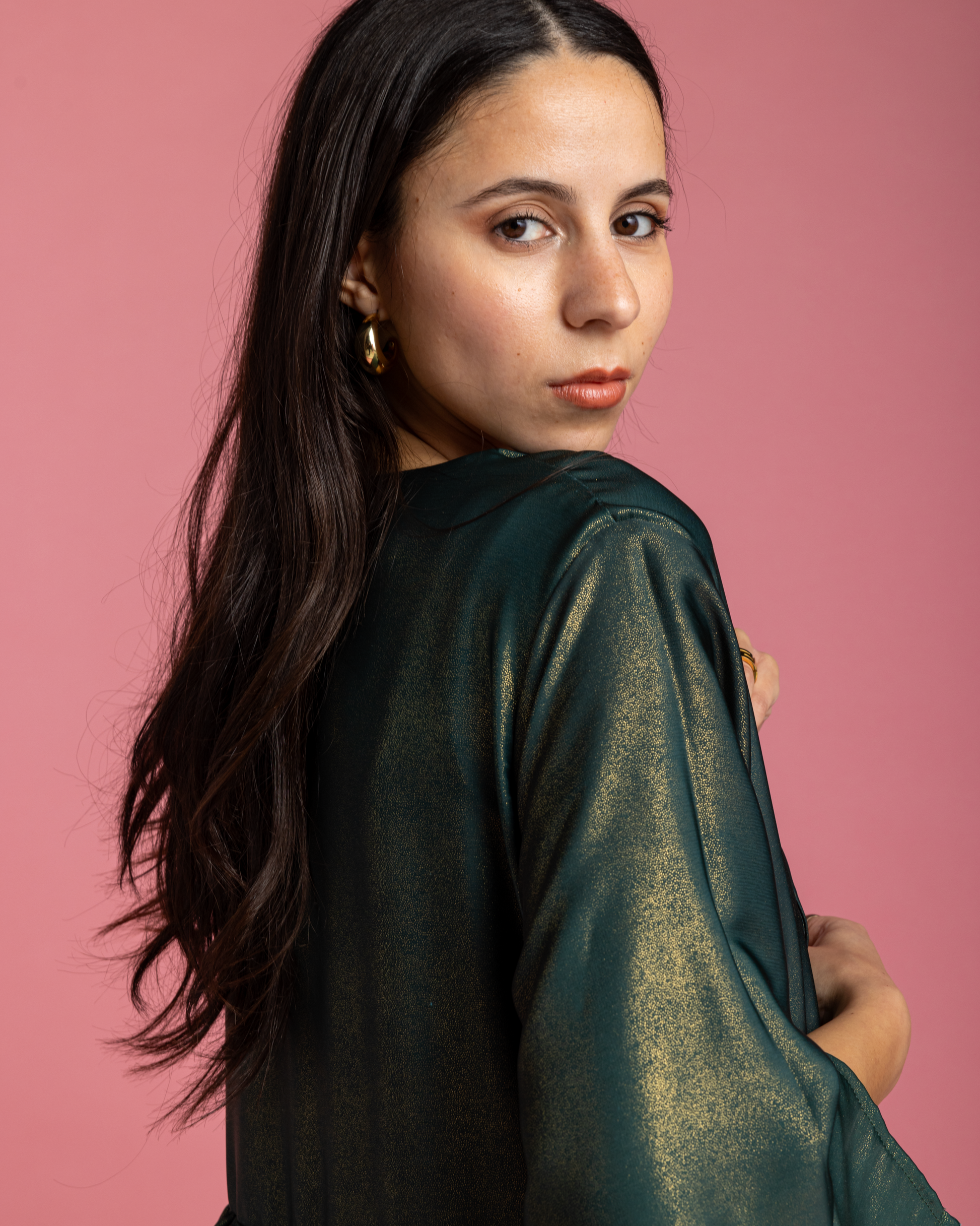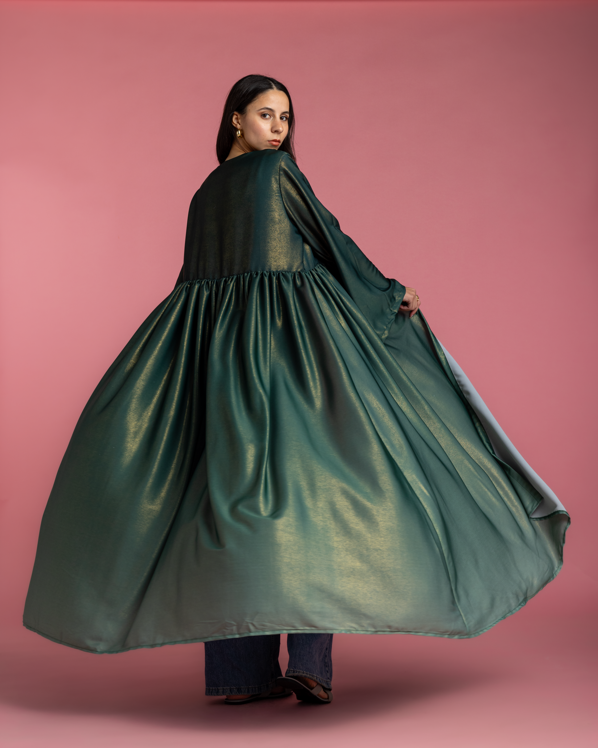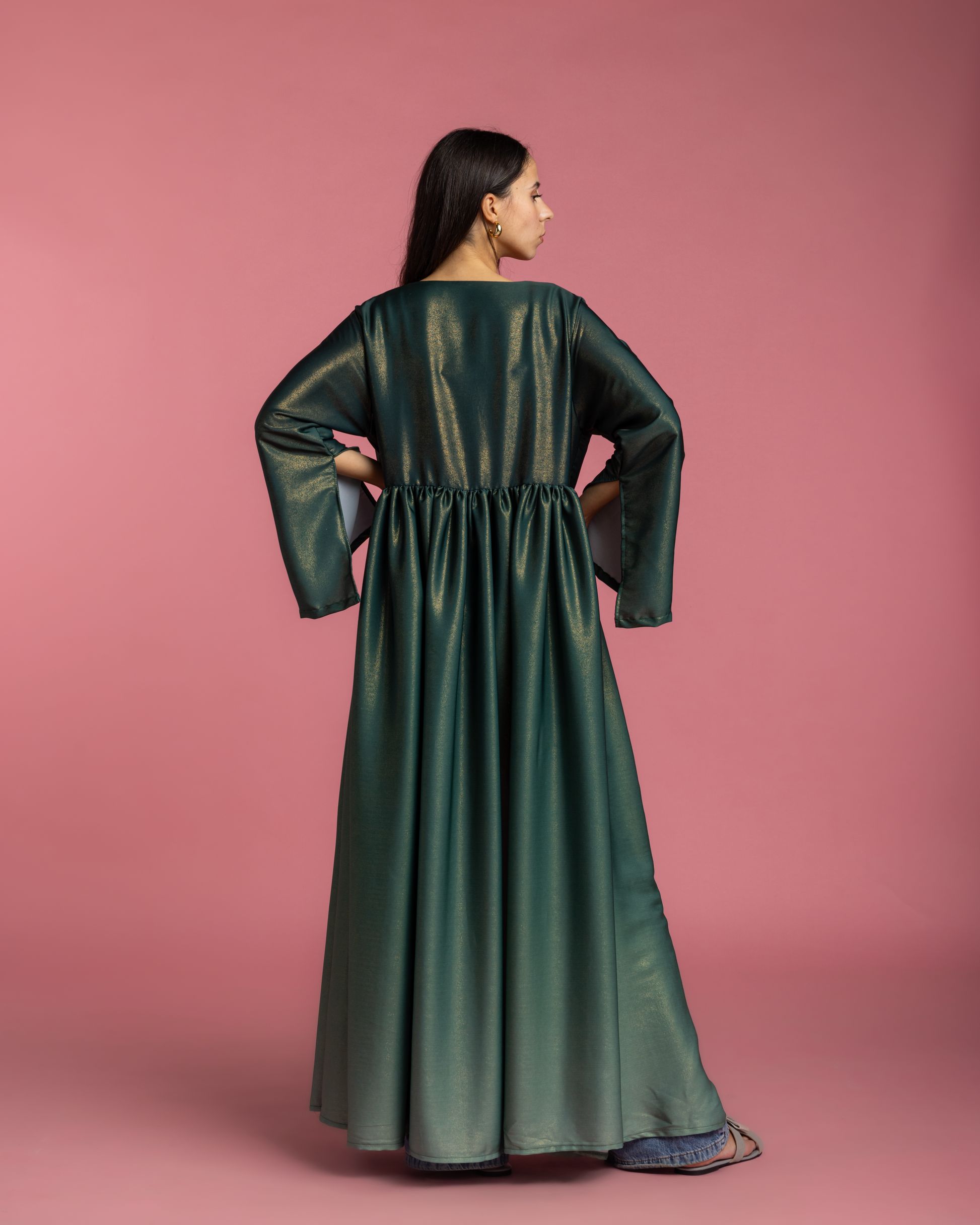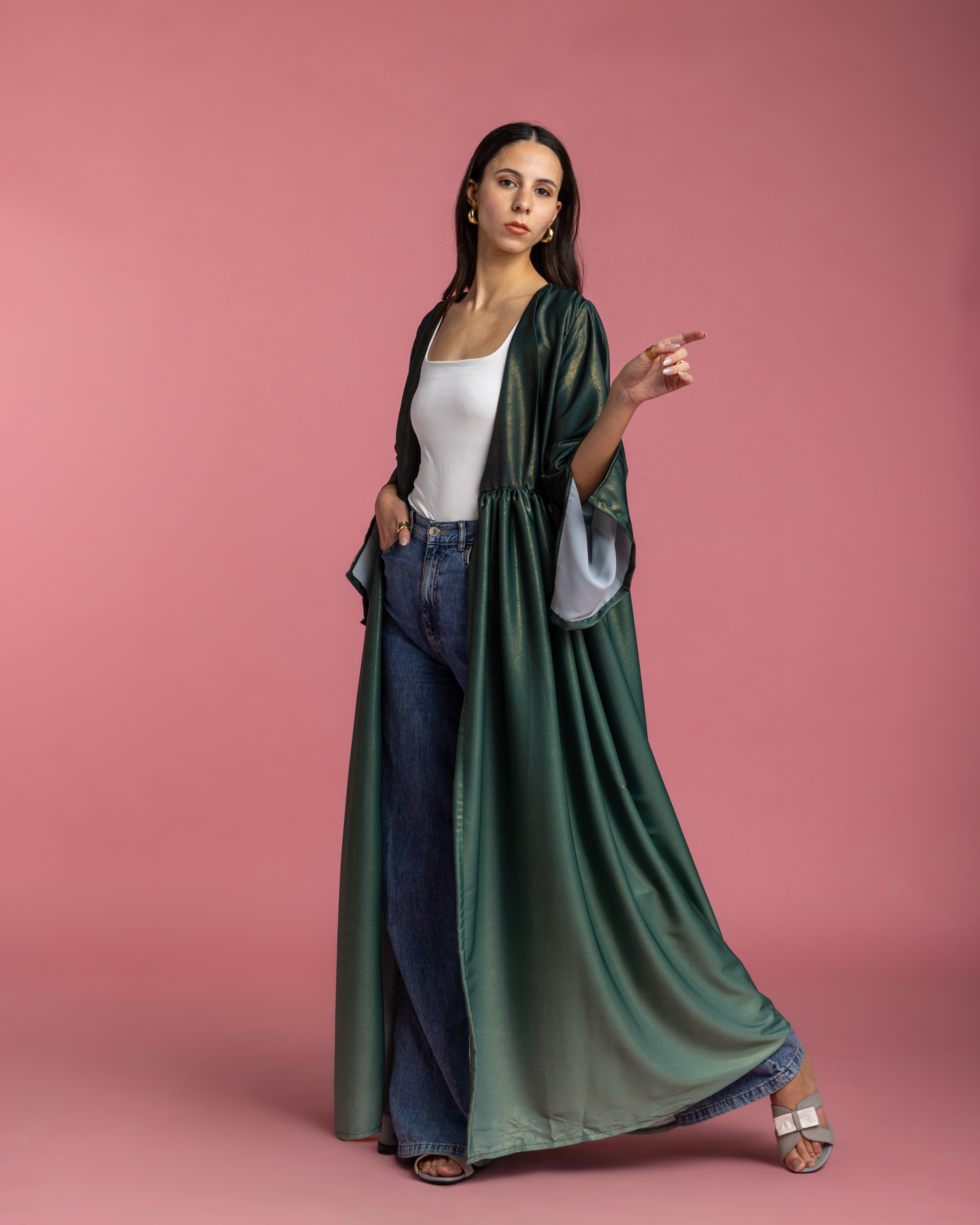 Feel pretty in our satin kimono. A beautiful green ombre with golden specs that will bring out the beauty of your outfit, and go great with Ramadan vibes.