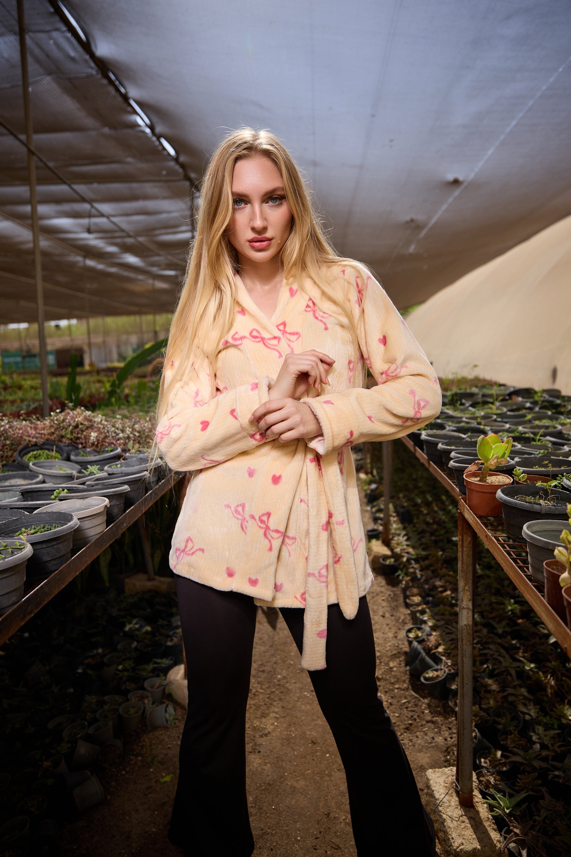 Cozy up on chilly days with this off-white robe adorned with playful pink bows and hearts. Made from a soft, partially cotton blend, it wraps you in warmth and comfort while adding a sweet, fun touch to your loungewear. Perfect for staying snug with a smile!