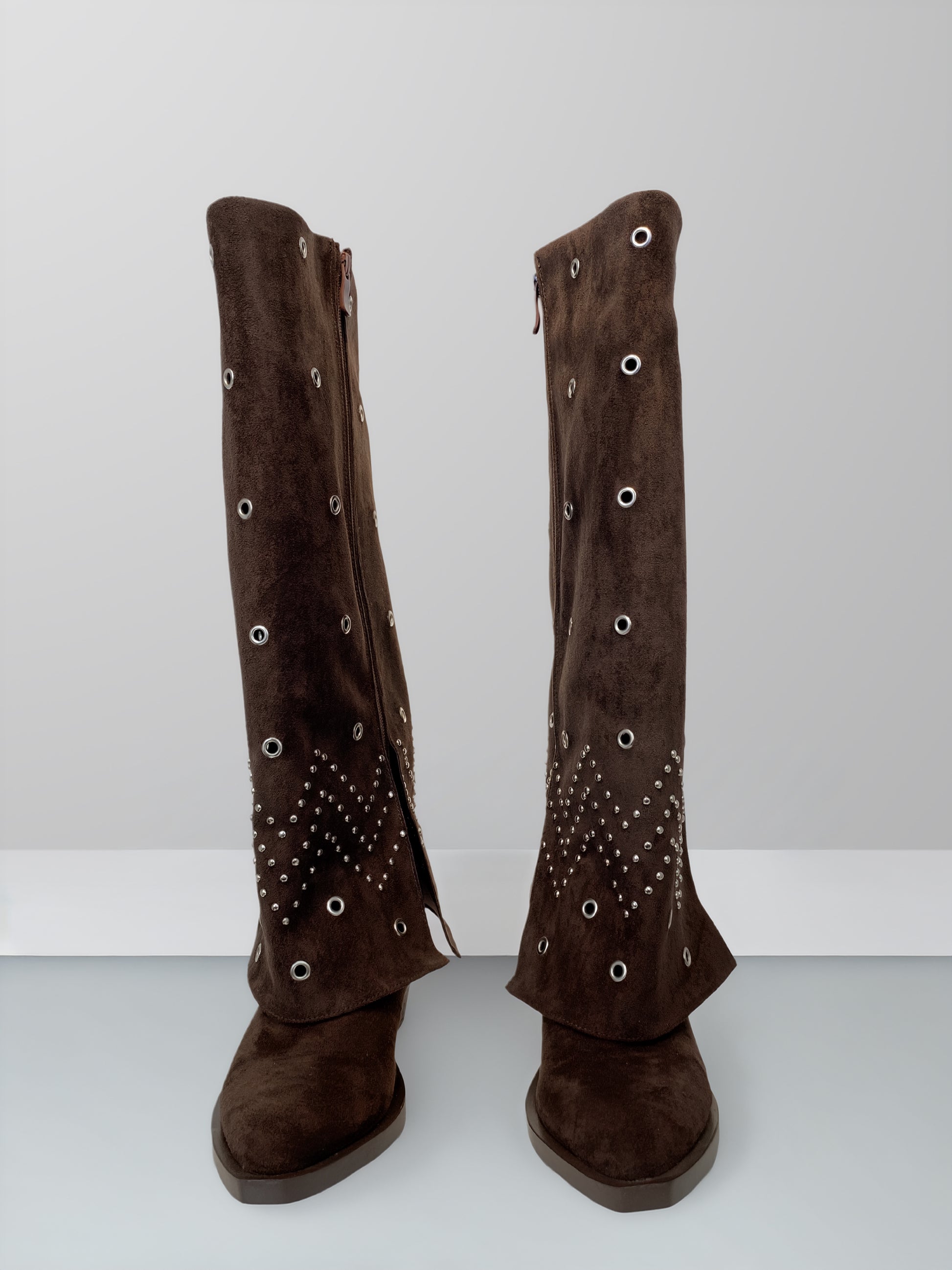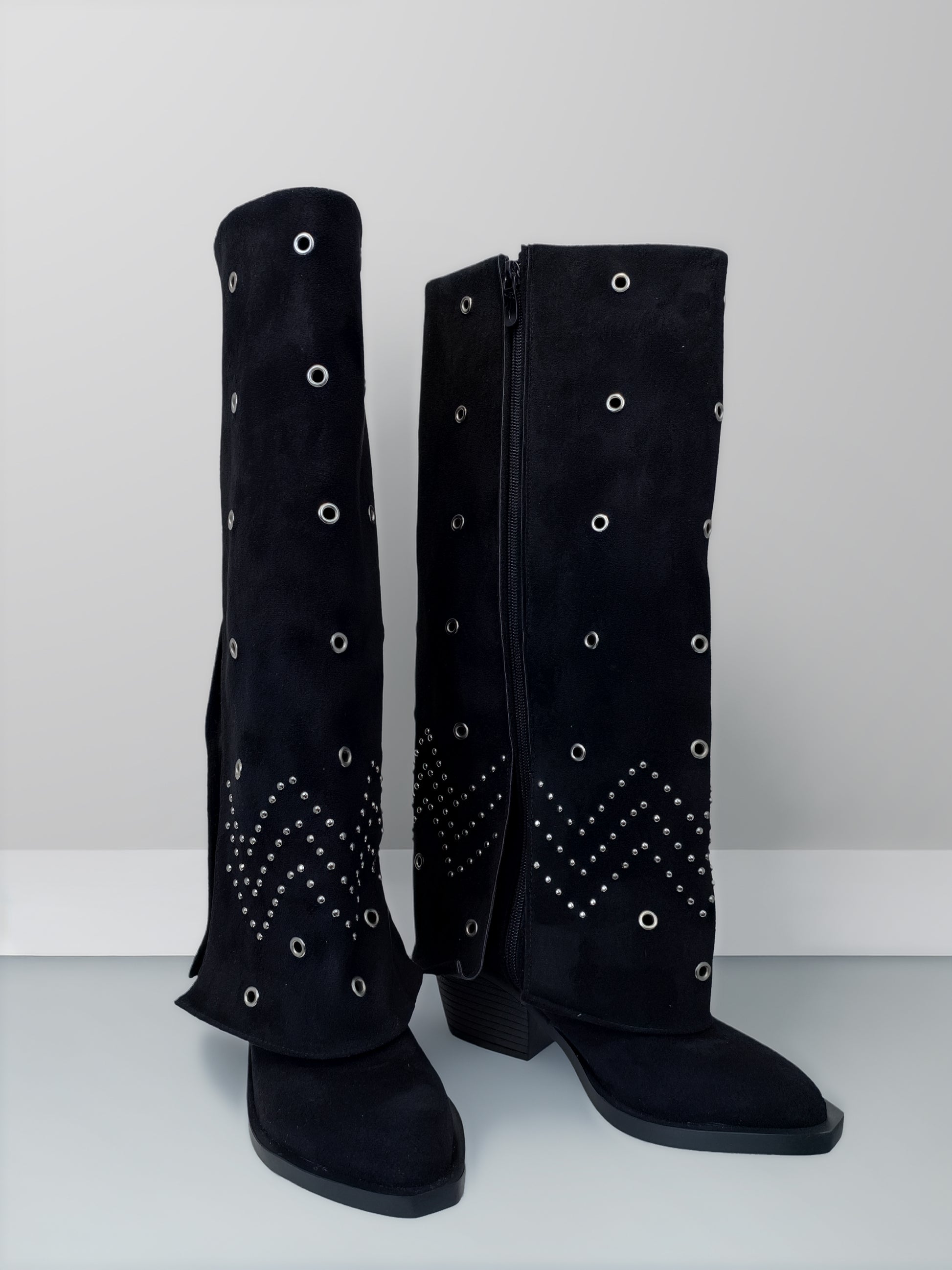 Step into effortless statement style with these knee-high suede boots. Crafted from soft, velvety suede, the design is elevated with metallic eyelet studs and a striking zigzag stud pattern around the calf for a bold yet refined look. The structured shaft offers a flattering silhouette, while the comfortable block heel provides stability for all-day wear.