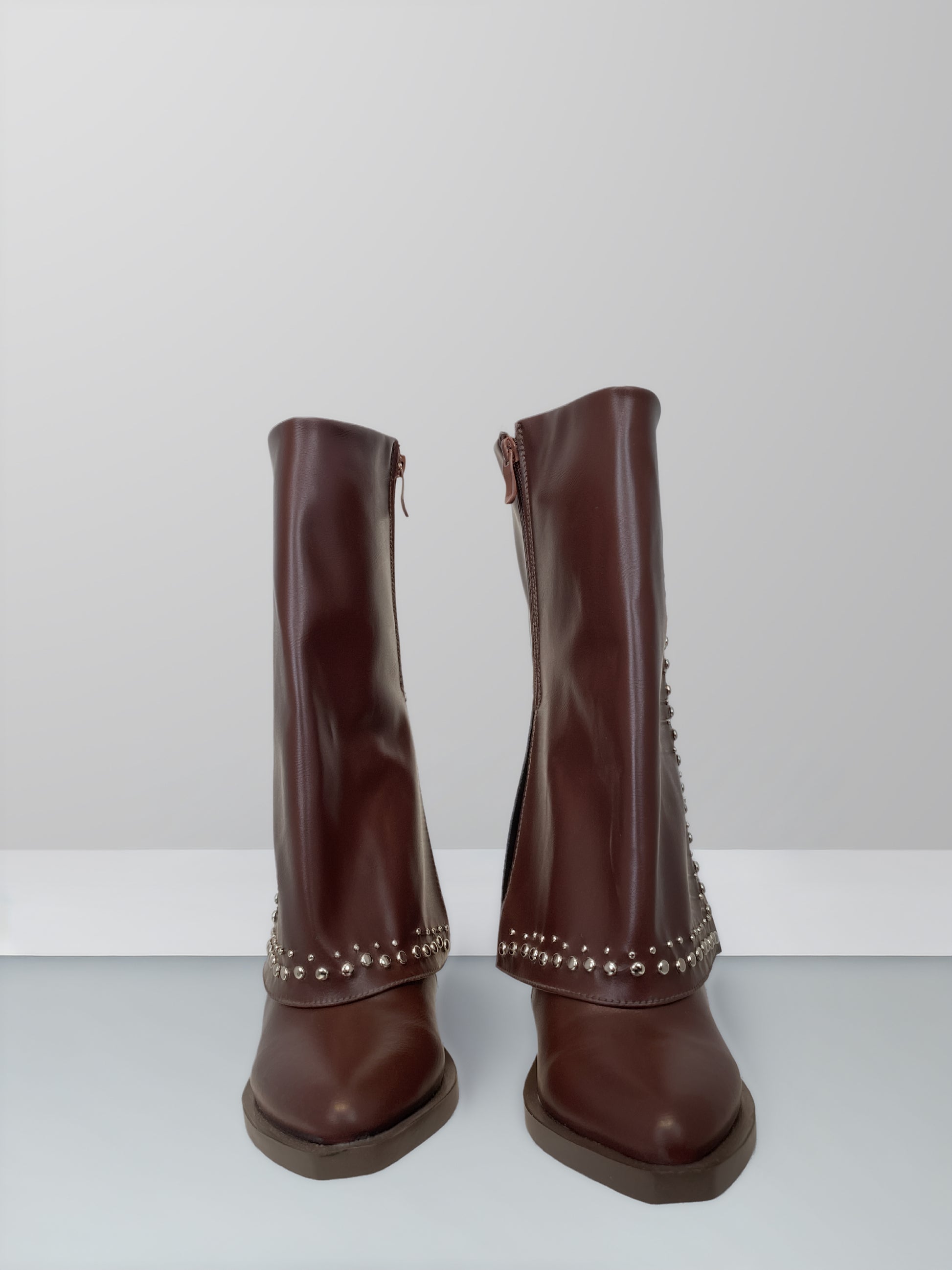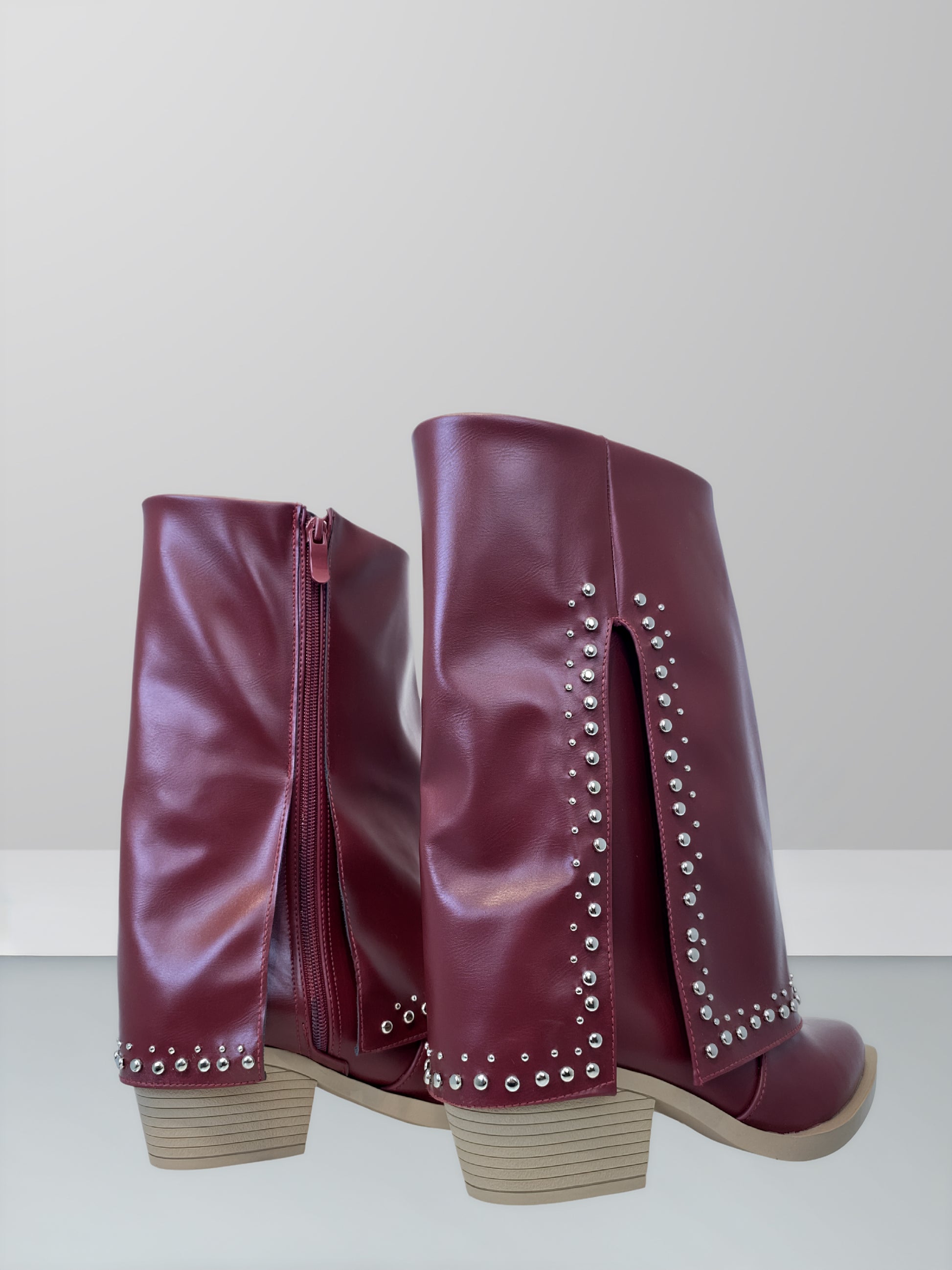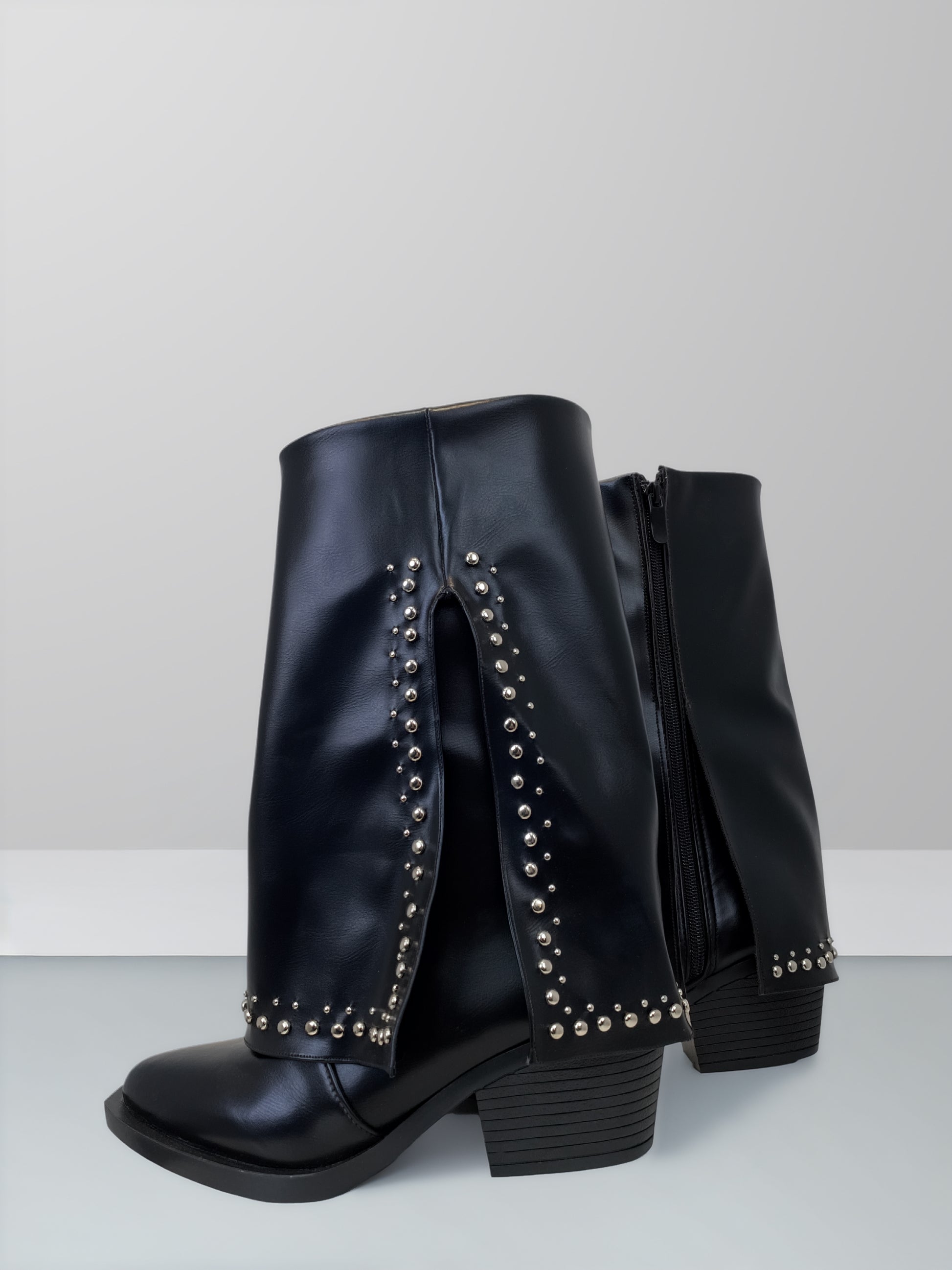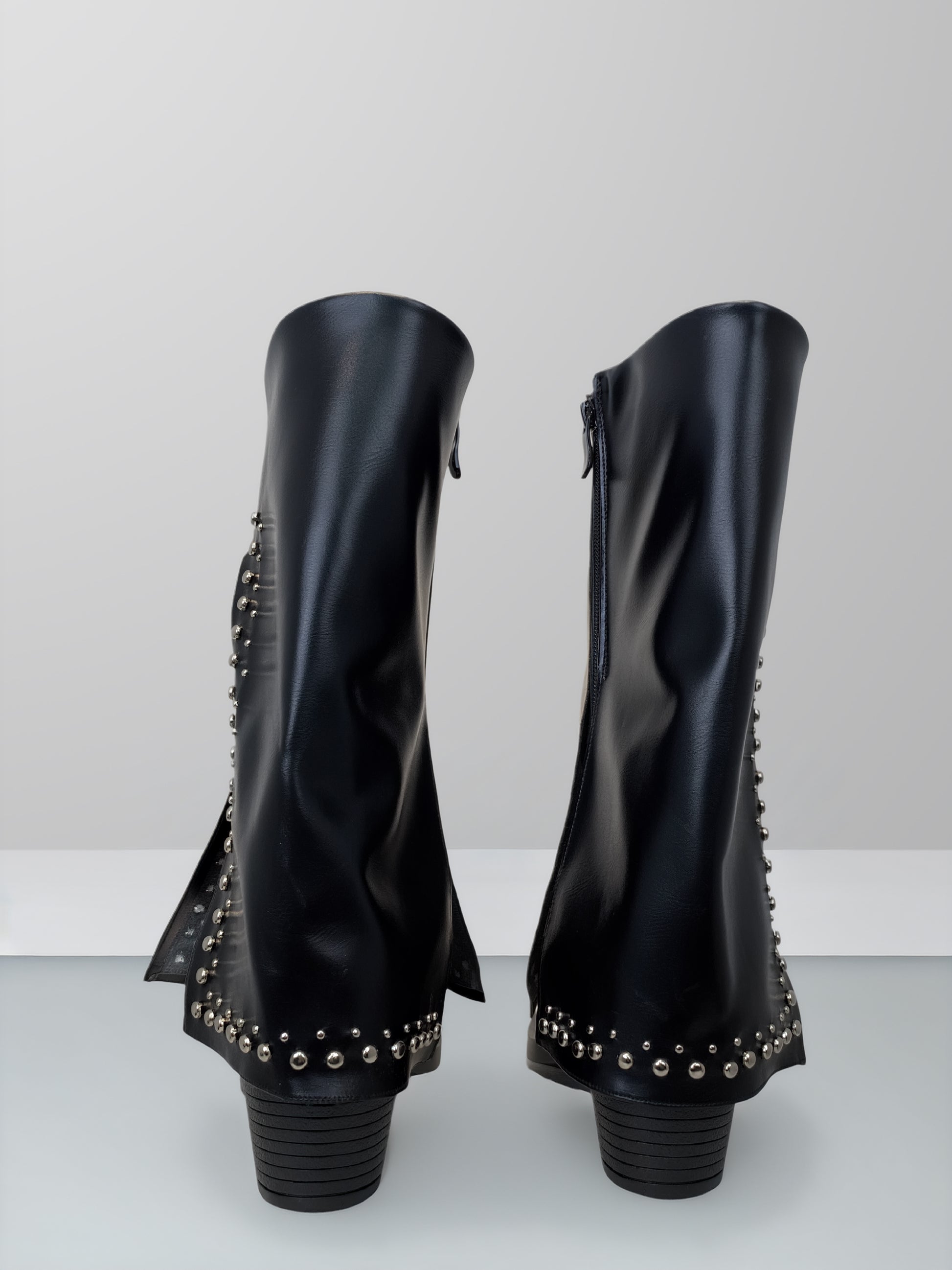 Designed for effortless everyday style, these mid-calf boots are crafted from high-quality vegan leather with a smooth, structured finish. Subtle metallic stud detailing adds a modern edge, while the layered panel design creates a flattering, fashion-forward silhouette. A side zipper ensures easy wear, and the low stacked heel offers comfort and stability throughout the day.