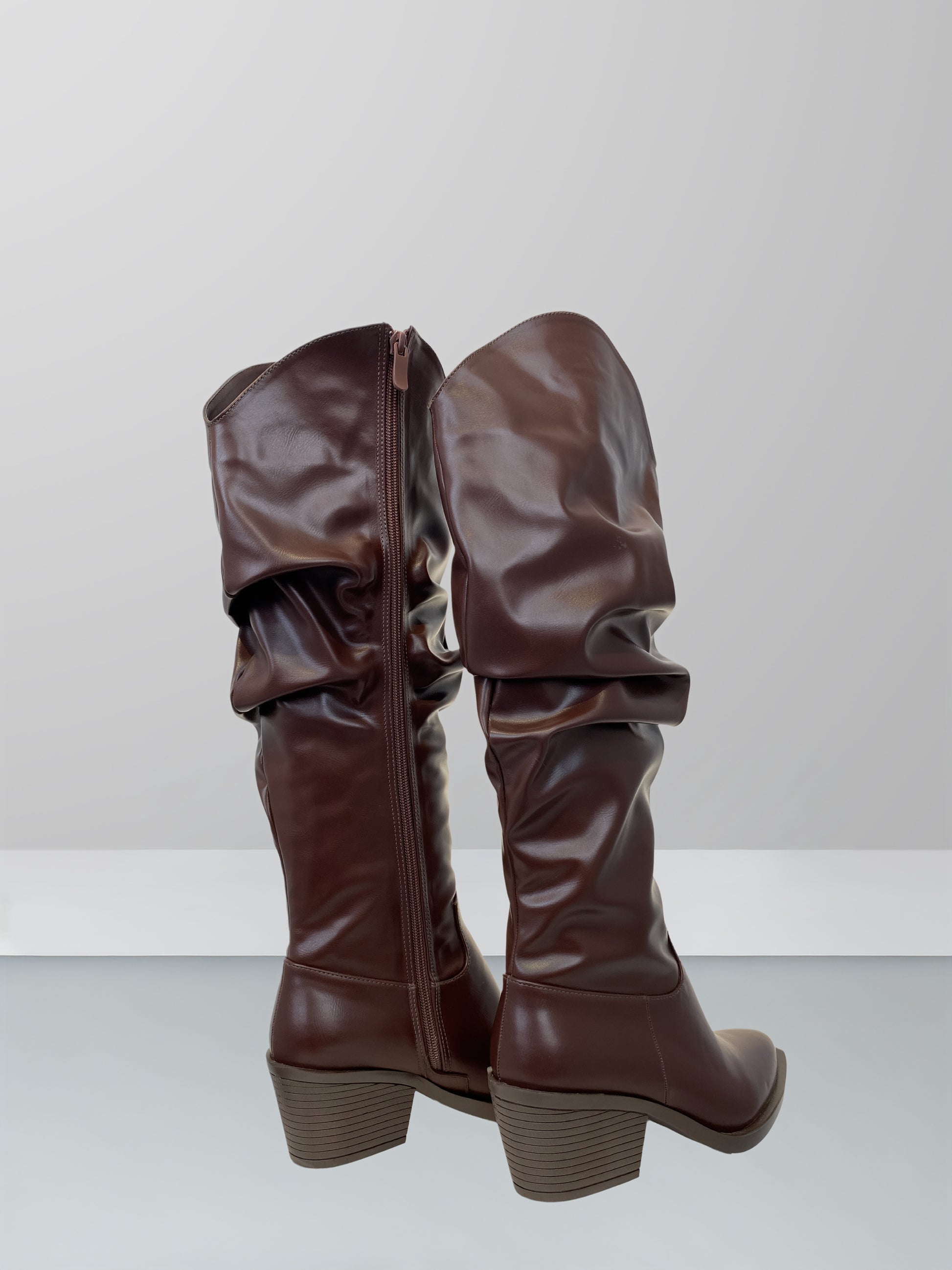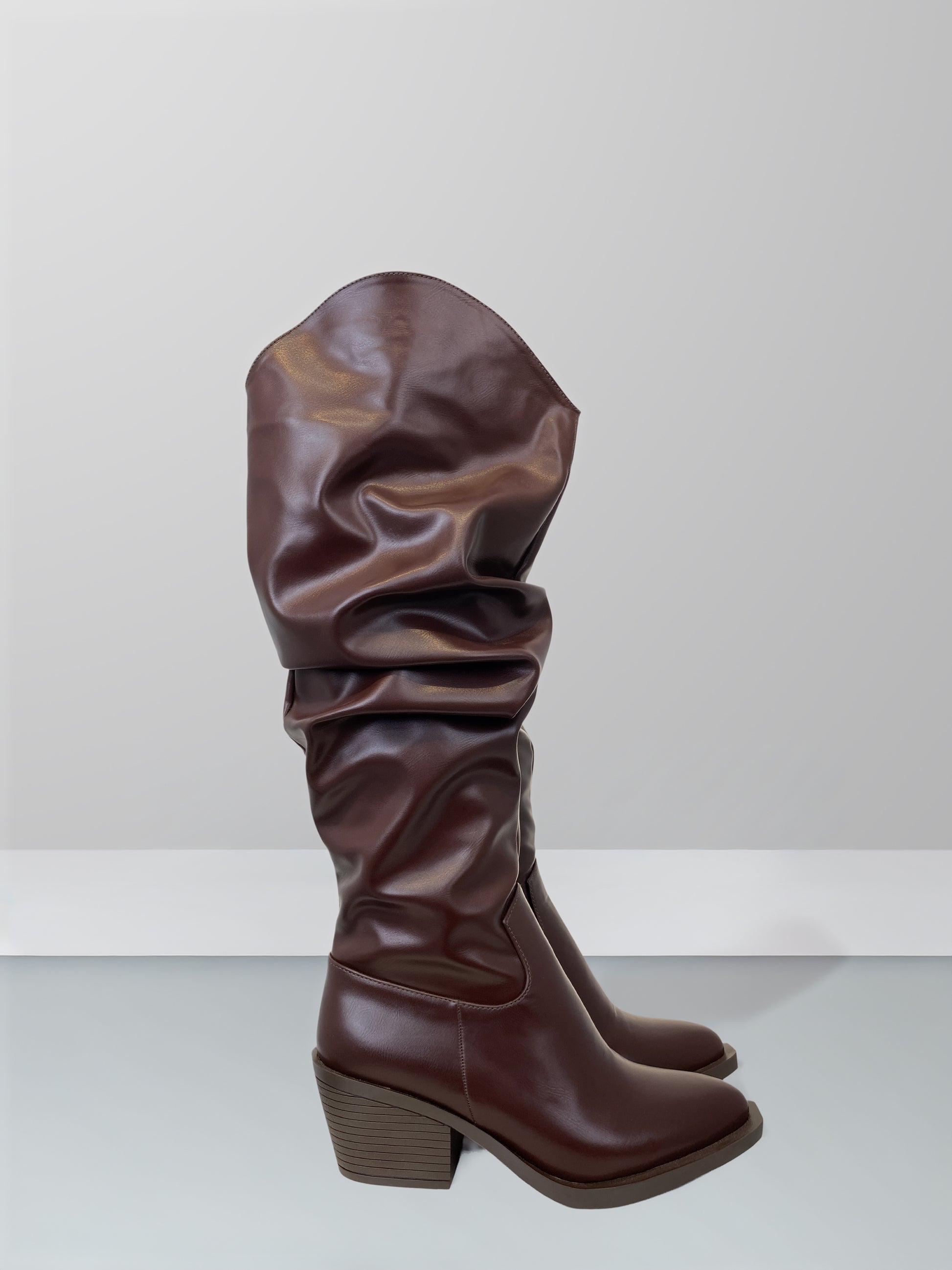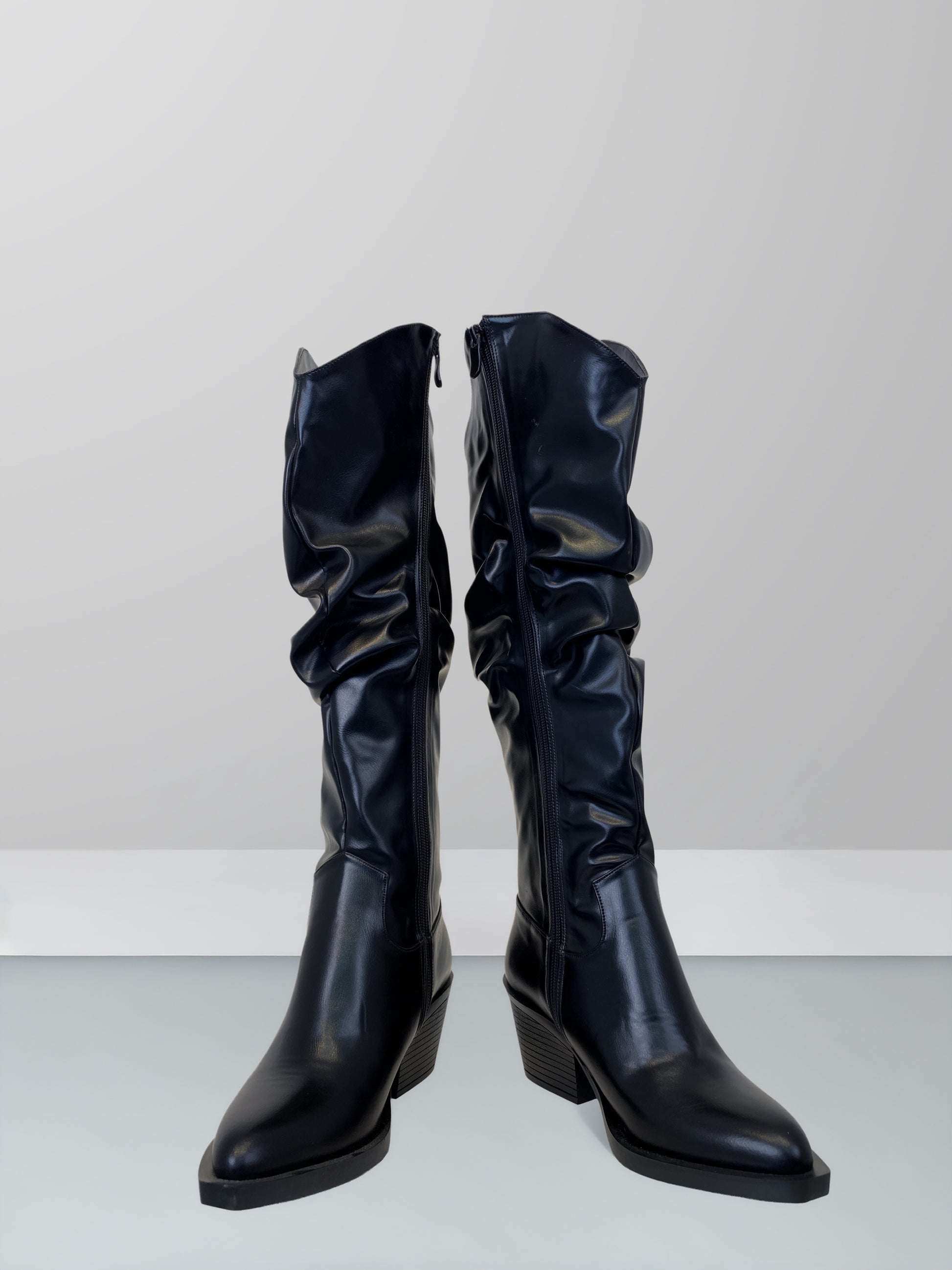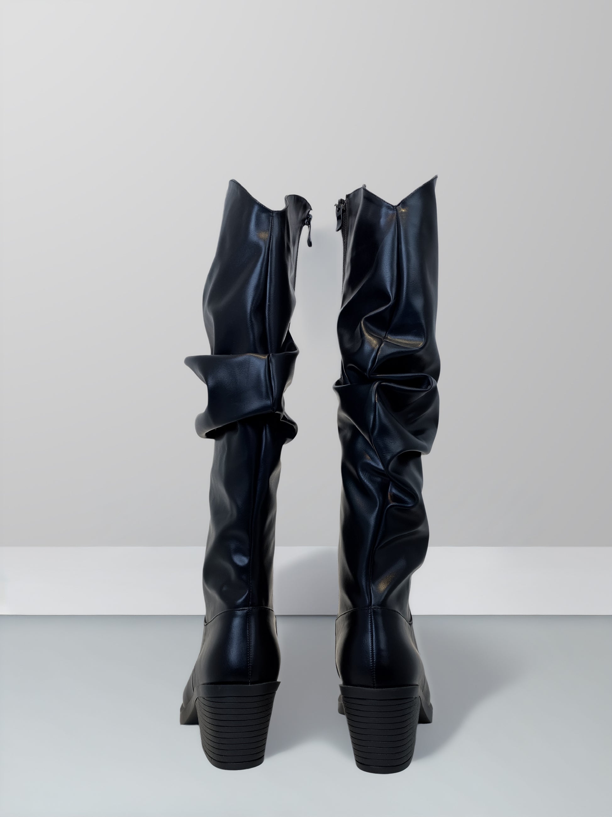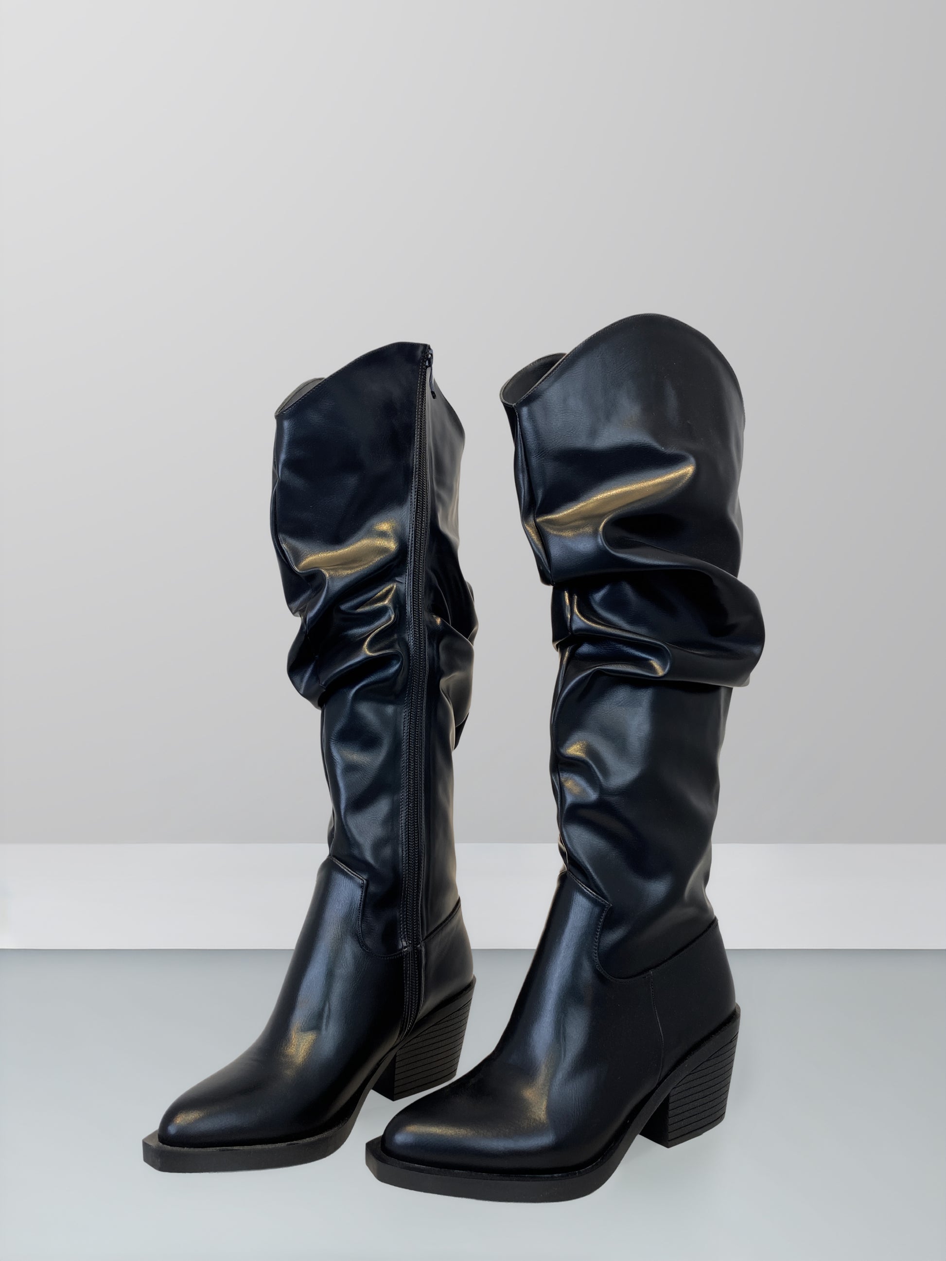 Make a bold yet effortless statement with these slouchy knee-high boots, crafted from premium vegan leather with a soft, lightly glossy finish. The relaxed, ruched shaft adds modern character, while the structured foot and comfortable block heel create the perfect balance between style and wearability. A side zipper allows for easy on and off, making these boots ideal for everyday wear.